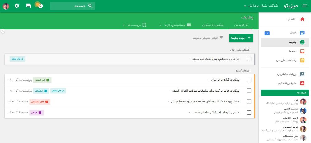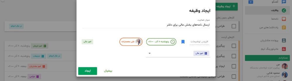 برای تعریف وظیفه جدید برای خود و یا دیگران میتوانید از طریق دکمه سبز رنگ بالای صفحه با عنوان ایجاد وظیفه استفاده کنید.