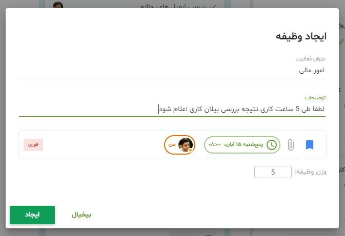 نهایتاً پس از انجام مراحل بالا با فشردن دکمه ایجاد در پایین پنجره، وظیفه جدید ایجاد و به فرد مورد نظر نسبت داده میشود.