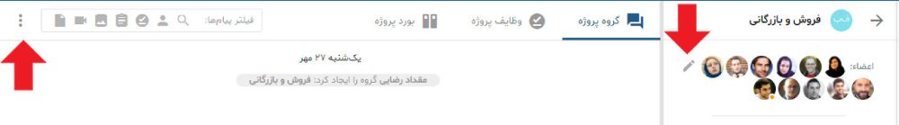 برای دسترسی به تنظیمات پروژه کافی است به آیکون مداد کنار تصویر اعضا و یا علامت سه نقطه در قسمت بالا سمت چپ مراجعه نمایید.