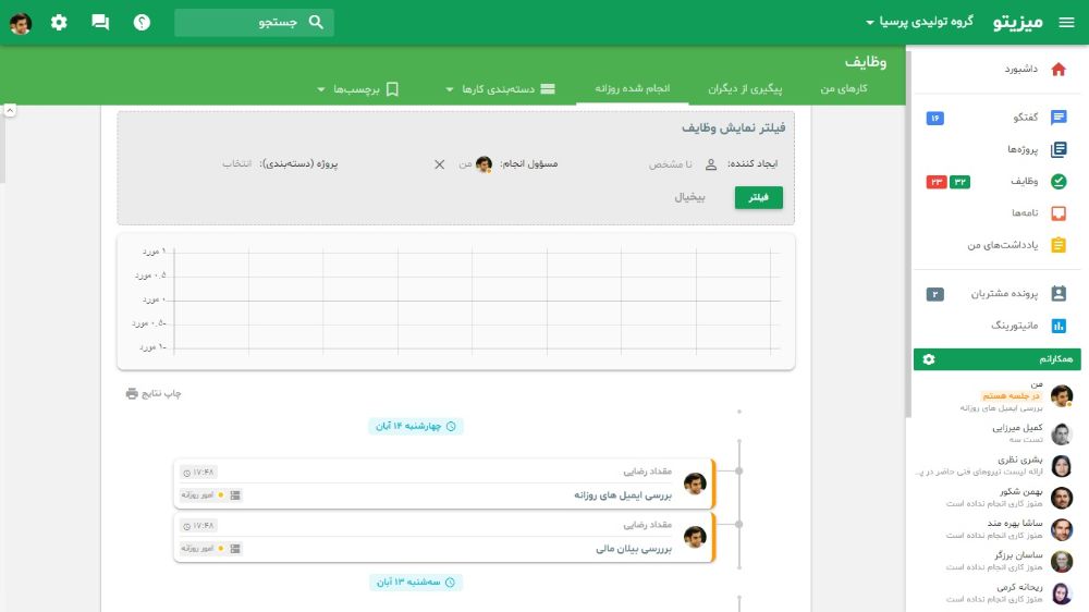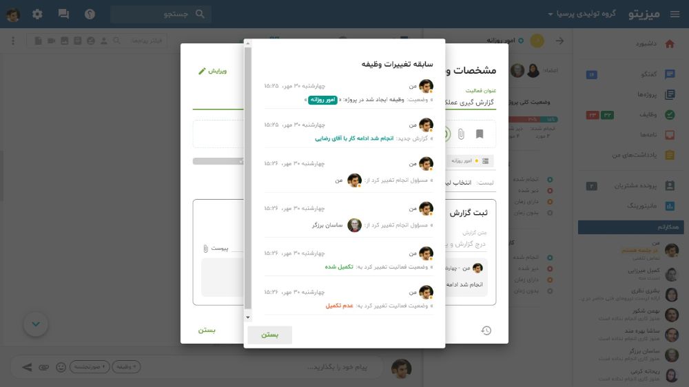در میزیتو تمام مراحل تغییرات ایجاد شده در یک وظیفه به صورت کامل و با جزئیات تاریخ و ساعت ثبت میگردد.