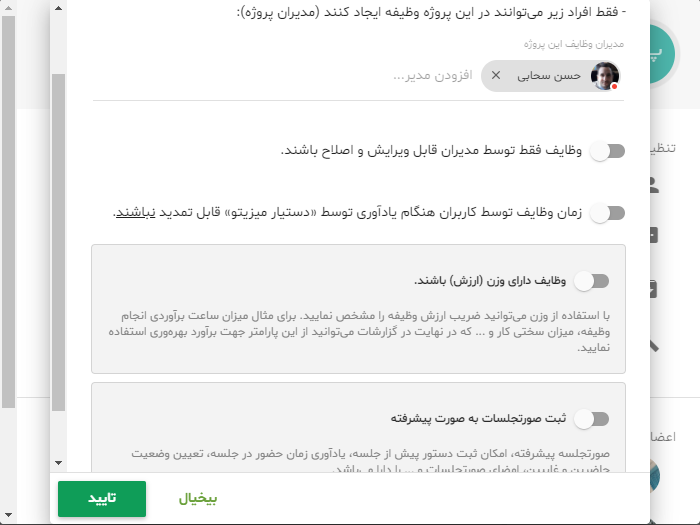در این قسمت میتوانید مشخص نمایید که امکان ویرایش و اصلاح وظایف صرفا توسط میدران انجام شود و یا اعضا هم قادر به ویرایش باشند.