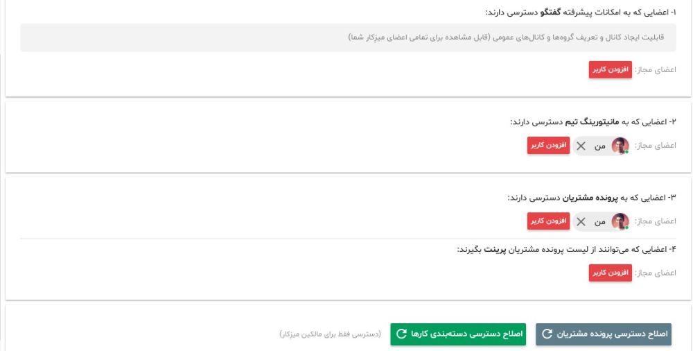 مجوزها:- تعریف اعضایی که به امکانات پیشرفته گفتوگوها، مانیتورینگ تیم، پرونده مشتریان و پرینت از لیست پرونده مشتریان دسترسی دارند.- امکان اصلاح دسترسی پرونده مشتریان و دستهبندی کارها از طریق دکمههای تعیین شده و بازگشت دسترسی به مالکین میزِکار.