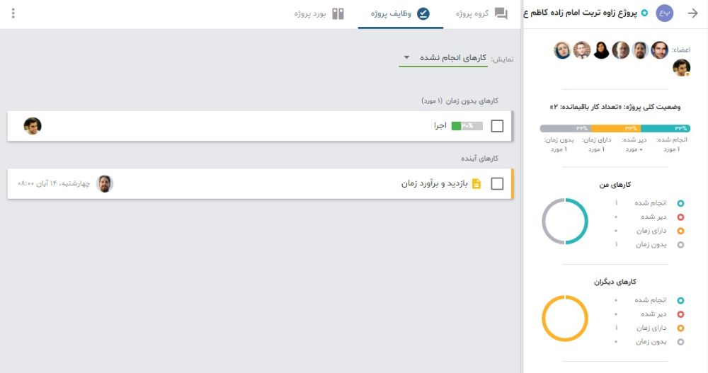 در بخش وظایف پروژه، وظایفی که در پروژه در جریان است نمایش داده میشود. امکان فیلتر این وظایف بر اساس وظایف انجام شده، انجام نشده، کارهای من، کارهای دیگران، کارهای دارای زمان، کارهای دارای تاخیر و کارهای بدون زمان وجود دارد.