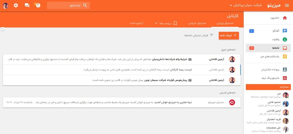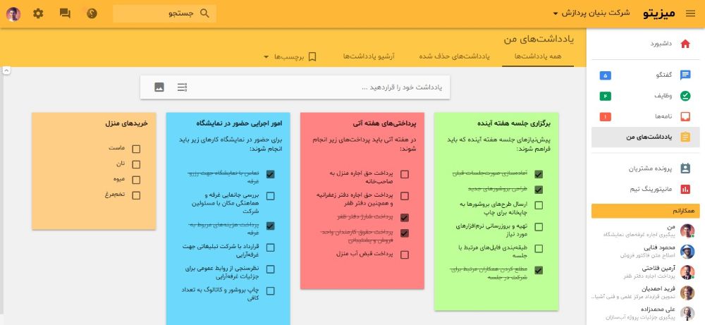 میزیتو، محصولی دانش بنیان متشکل از مجموعهای کاربردی از سرویسهای مختلفی اعم از چت و گفتوگو، ایجاد و مدیریت وظایف، ارسال نامه و مکاتبات، ایجاد یادداشت و مدیریت مشتریان است که مدیریت پروژه را برای شما آسان میکند.