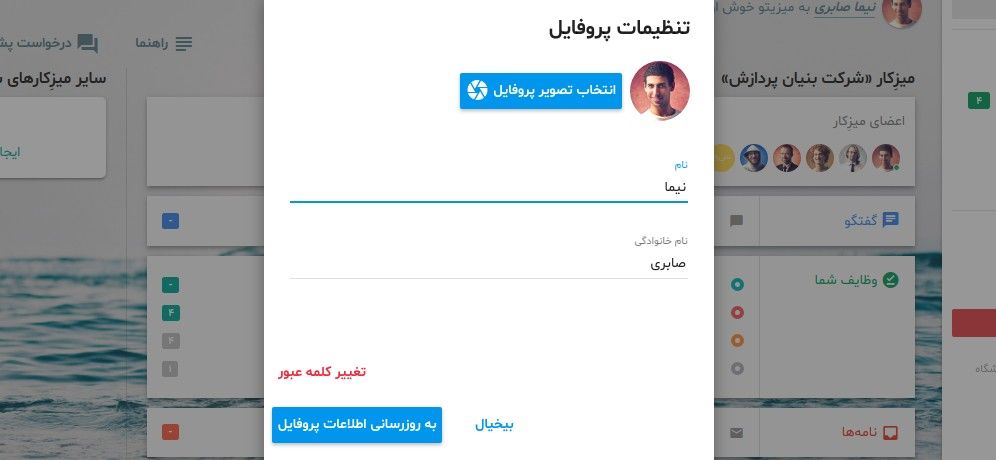 در پنجره باز شده شما امکان انتخاب و تغییر تصویر پروفایل (با کلیک بر روی دکمه انتخاب تصویر پروفایل)، تغییر نام و نامخانوادگی و نیز تغییر کلمه عبور را با فشردن دکمه تغییر کلمه عبور دارید.