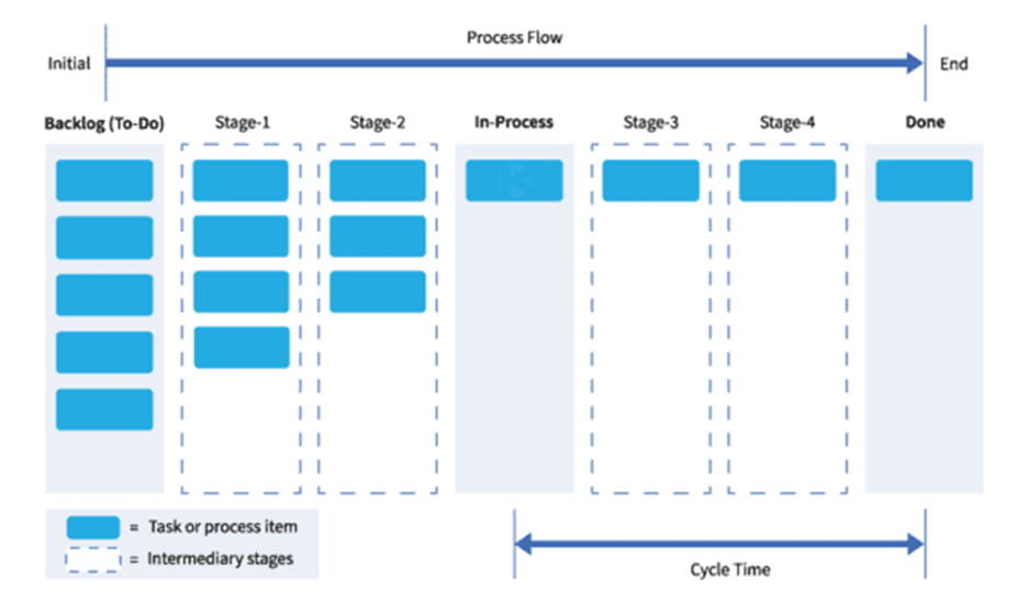 3. مدیریت جریان: نظارت مداوم بر جریان کار کمک می کند تا تأخیرها یا گلوگاه ها شناسایی و رفع شوند و پیشرفت مداوم تضمین شود. اینکار همچنین باعث کاهش Lead Time می شود (مدت زمان صرف شده بین شروع یک کار و انتقال آن به ستون "Done" در تابلو کانبان)