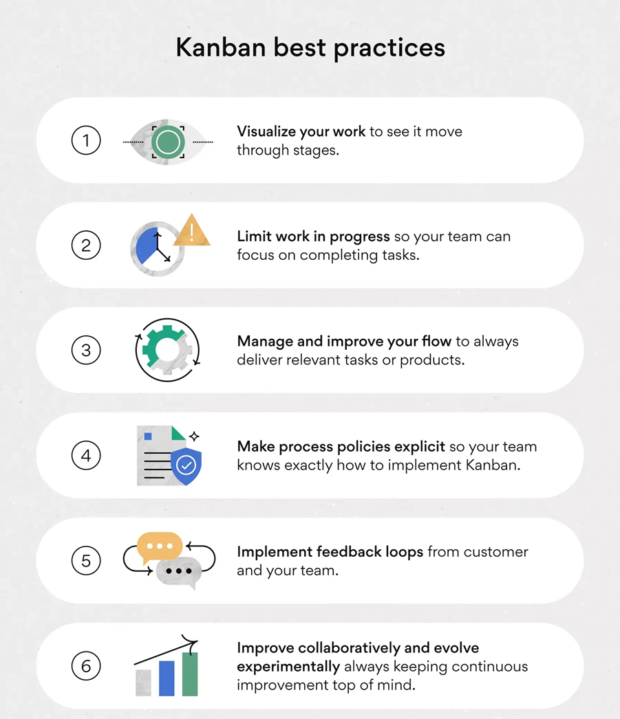 کانبان توسط مجموعه ای از شیوه ها هدایت می شود که به تیم ها کمک می کند بر بهبود مستمر و مدیریت مؤثر وظایف تمرکز کنند: