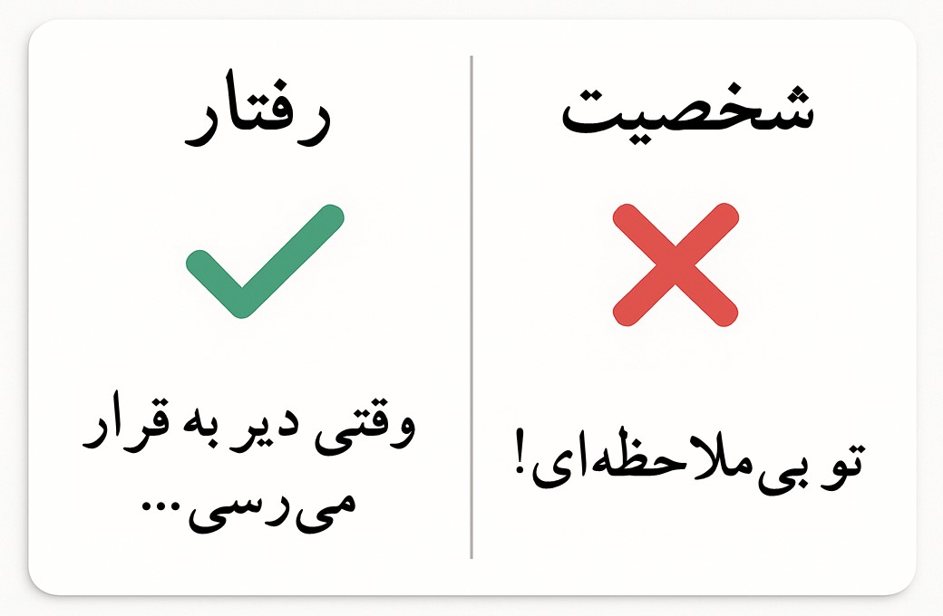 این چیست؟ این یکی از قدرتمندترین تکنیکها در مدیریت تعارض و ارائه بازخورد است. به جای برچسب زدن به شخصیت فرد (که تدافعی است)، شما روی یک رفتار خاص، قابل مشاهده و عینی تمرکز میکنید.