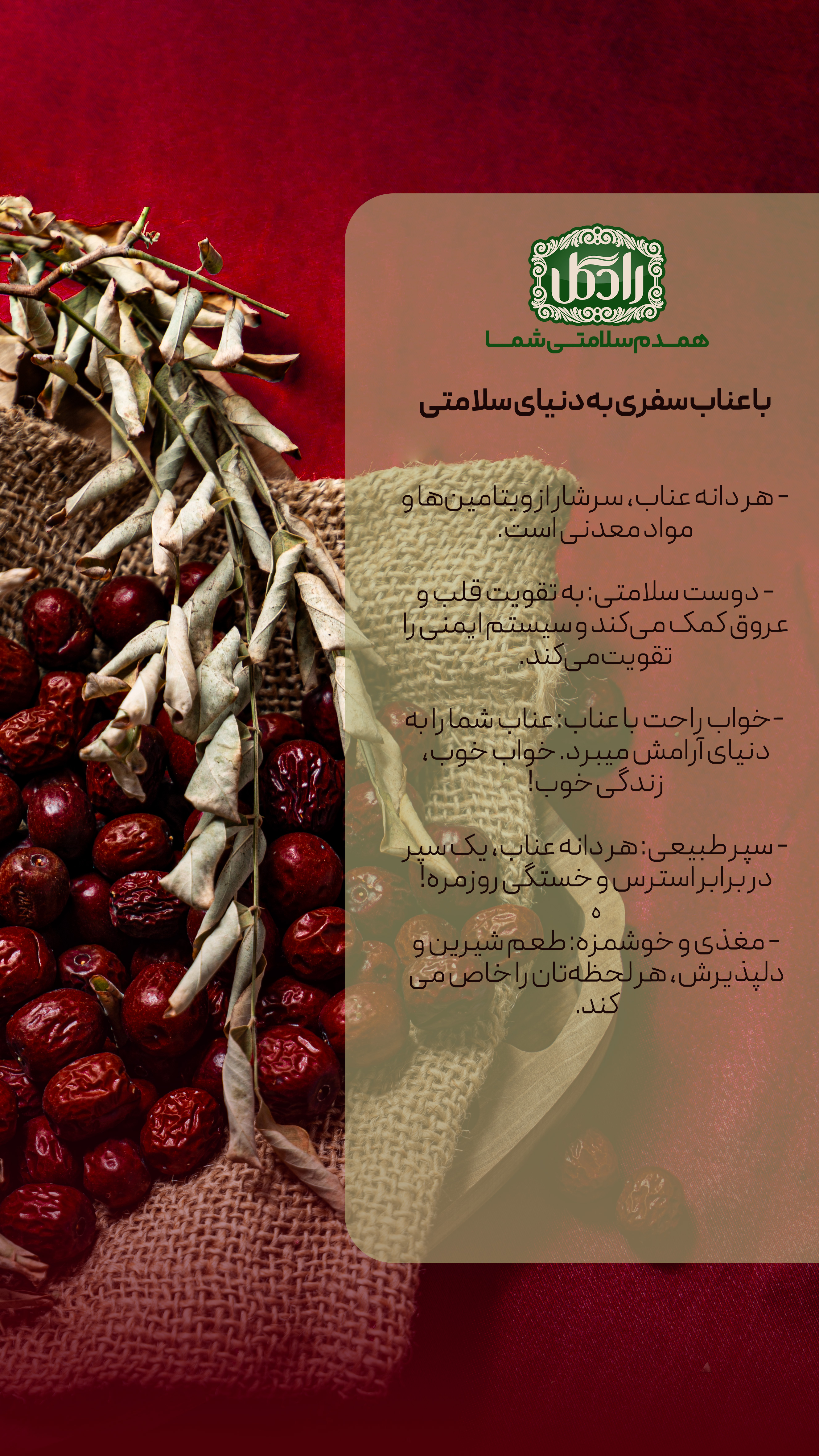 شرکت پارسیان تجارت رادگل با بهرهگیری از مزارع اختصاصی و فرآوری بهداشتی، بهترین عناب تازه و خشک را بهصورت عمده و خرده عرضه میکند.