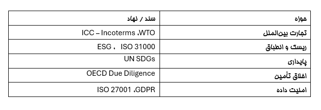 زنجیره تأمین علاوه بر آنها قوانین کلان تجارت، ریسک، و پایداری (WTO, ICC, ISO 28000)