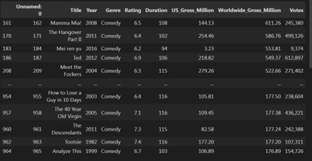توجه کنید که خروجی فقط شامل ۳۰۷ ردیف از مجموع ۳۴۰۰ ردیف کل دادههاست. اگر خودتان خروجی را بررسی کنید، خواهید دید که مقدار ستون Genre در همهی این ردیفها برابر با "Comedy" است.