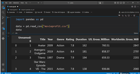 اولین قدم در تحلیل داده ، بارگذاری دیتاست مورد نظر در محیط کاری است. دیتاست movieprofit.csv رو دانلود کنید و در پوشه پروژه قرار دهید.
