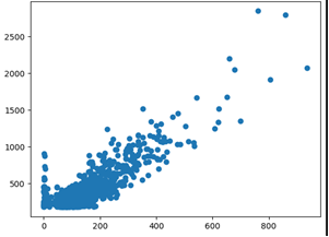 import pandas as pd import matplotlib.pyplot as plt data = pd.read_csv("movieprofit.csv") plt.scatter(data["US_Gross_Million"], data["Worldwide_Gross_Million"])