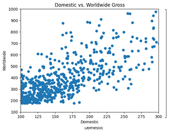میتوانید این اطلاعات را با استفاده از کد زیر تنظیم کنید. نمودار نهایی نشان میدهد که بین فروش داخلی (Domestic Gross) و فروش جهانی (Worldwide Gross) یک همبستگی مثبت وجود دارد.