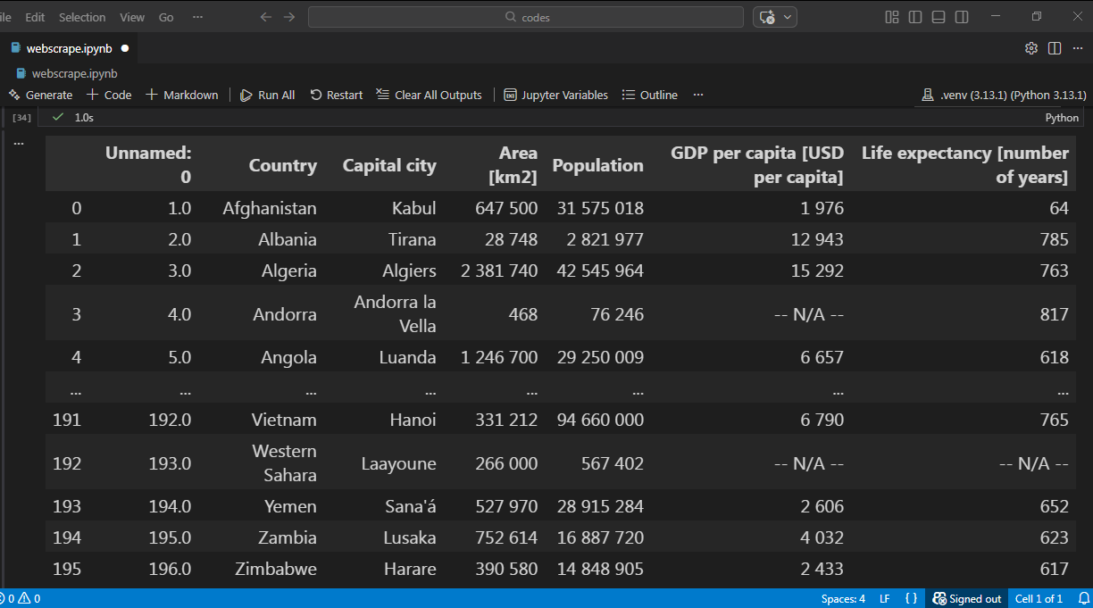 با فراخوانی متغیر DataFrame، میتوانیم داده استخراجشده را در قالب جدولی مشاهده کنیم.