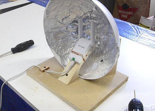 حالا قبل اینکه آنتنی که ساخته اید را به سقف وصل کنید و آنتن دیگر را بیرون از خانه قرار بدید از یک ظرف بزرگ یا هرچیزی که بتونه به شکل دیش باشه برداشته و اون رو فویل بپیچید طوری که فویل کلا اور رو بپوشاند و بعد آنتی که ساختید رو توی خونه و آنتن دیگر که به دیش وصل شده را روی سقف قرار بدید
