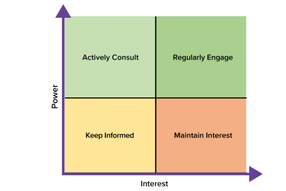 از ابزار «ماتریس Power/Interest» استفاده کن و مشخص کن که با هر ذینفع باید چطور تعامل کنی: