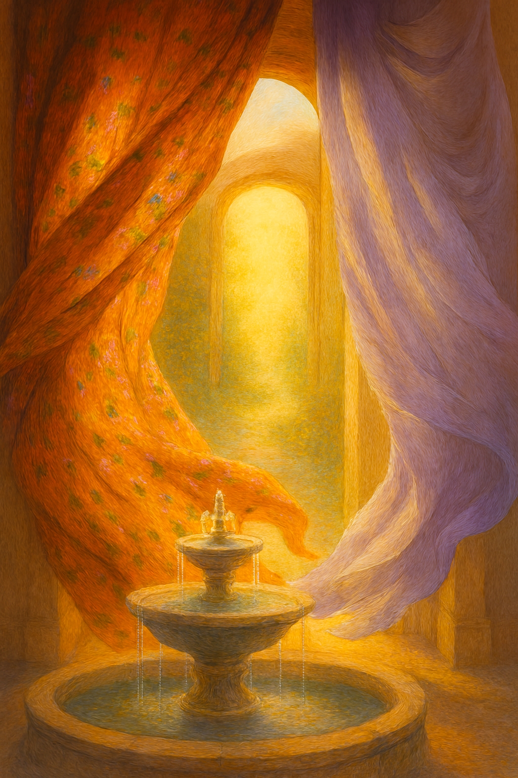 در انتهای اِل مانند آشپزخانه به نا گاه چشمش به حوضی مرمرین می افتد ,نوری ملایم همه جا را در برگرفته،فضا ناگهان تغییر میکند ،ذرات نور در برخورد با قطرات ریز آب در هوا تلألو با شکوهی را بوجود آورده. سکوتی اَمن همه جا را در برگرفته.