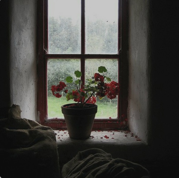 طاقچه یکی سالهات غبار خاک از روی آن پاک نشده ، دیگری گل شمعدانی پژمرده ای را در بغل گرفته است.