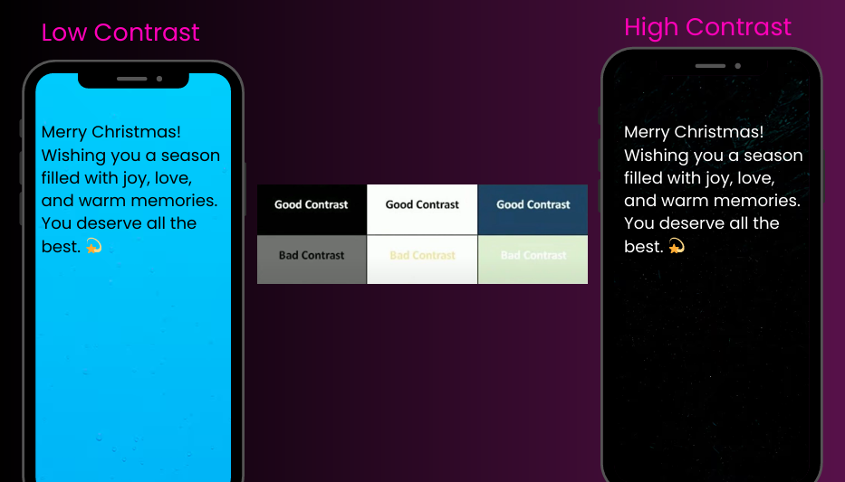 اگر به عکس نگاه کنید متوجه میشوید که برخی متن ها را راحت تر نمی توانیم بخونیم . در سمت راست موبایلی را میبینید که بکگراند مشکی داره و متن سفید رنگ دارد این باعث میشود یک تضاد رنگی به وجود بیاد و کاربر راحت تر بتواند بخواند. درحالی که سمت چپ یک موبایلی را مشاهده میکنید با بکگراند ابی و رنگ متن مشکی این باعث میشود انچنان تضاد رنگی ای به وجود نیاد و کاربر نتواند راحت بخواند!