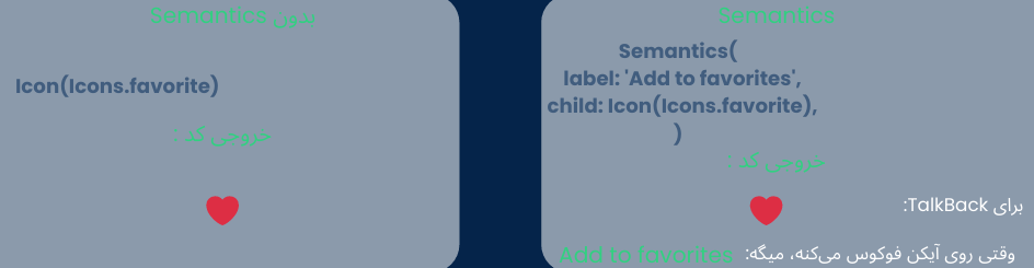 سمانتیک یک ویجت، دکمه یا کد خاص نیست در واقع یک لایهی نامرئی از اطلاعات است که روی عناصر صفحه قرار میگیرد این لایه فقط برای سیستمعامل و ابزارهای کمکی مثل Screen Readerها وجود دارد، نه برای چشم کاربرمن برای واضح شدن داخل عکس نشون دادم کدی را همراه با Semantics و بدون Semantics