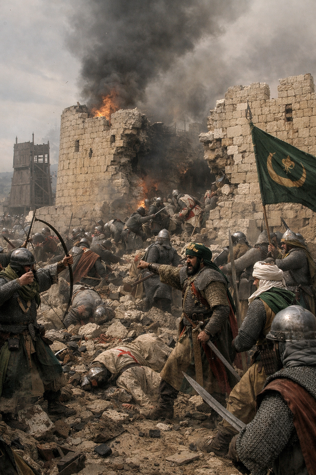 در داخل دژ، مدافعان که ترکیبی از شوالیهها و سربازان پیاده بودند، مقاومت سرسختانهای نشان دادند. آنان میدانستند که سقوط این موضع چه پیامدی خواهد داشت. اما عملیات مهندسی مهاجمان تعیینکننده شد. پس از چند روز نبرد شدید، بخشی از دیوار فرو ریخت و شکافی بزرگ ایجاد شد. نیروهای صلاحالدین از رخنه وارد شدند و نبرد تنبهتن در فضای محدود و آکنده از دود و آتش آغاز شد.