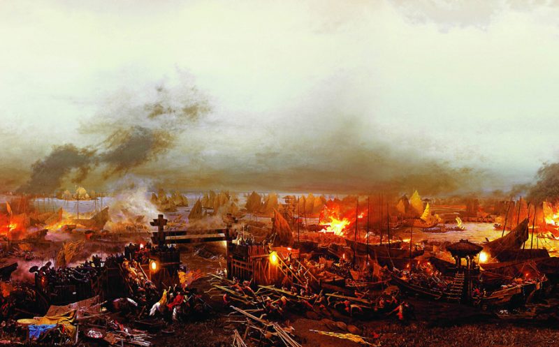 در جریان نبرد اصلی، استراتژی تعیینکنندهای بهکار گرفته شد: حملهٔ آتشین روی رودخانه. متحدین جنوب تحت فرماندهی ژنرال هوانگ گای (Huang Gai) نقشهای را اجرا کردند که در آن گویی قصد خیانت به جبههٔ متحد داشت، اما در حقیقت قایقهای مملو از مواد آتشزا را به سمت ناوگان سائو سائو روانه نمود. وقتی باد شرقی-جنوب شرقی برخاست، این کشتیهای آتشزا به سرعت در ناوگان سائو سائو پخش شدند و با آتش گرفتن کشتیهای بهم زنجیر شده، فاجعهای برای ارتش بزرگ شمال رقم زد.
