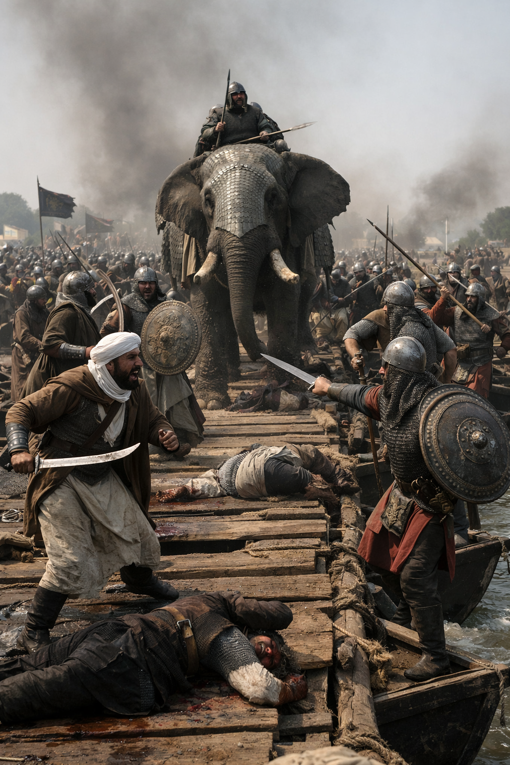 به فرمان ابوعبید بن مسعود ثقفی (فرمانده سپاه مسلمانان)، پلی شناور از قایقها روی فرات ساخته شد تا لشکر عرب از رود عبور کرده و به سپاه ایرانی نزدیک شود. هنگامی که سپاه مسلمان از پل عبور کرد، دیدار با سپاه ساسانی موجب ترس اسبهای آنان شد؛ فیلهای جنگی ایرانیان راه را باز نگه داشتند. ابوعبید به یک فیل سفید حملهور شد اما همین فیل، او را از اسب پراند و زیر پای خود له کرد. با کشته شدن ابوعبید و از هم پاشیدن خط مقدم اعراب، بسیاری از جنگجویان پراکنده و قسمتی از سپاه تا نزدیکی رود فرار کردند؛ بخش قابل توجهی از نیروهای مسلمان در حین عقبنشینی کشته یا غرق شدند. در این میان، مثنی بن حارث شیبانی و گروهی از سربازان مسلمان تا پایان جنگ در تلاش برای تعمیر پل باقی ماندند تا فرصتی برای عقبنشینی سایر نیروها فراهم شود.