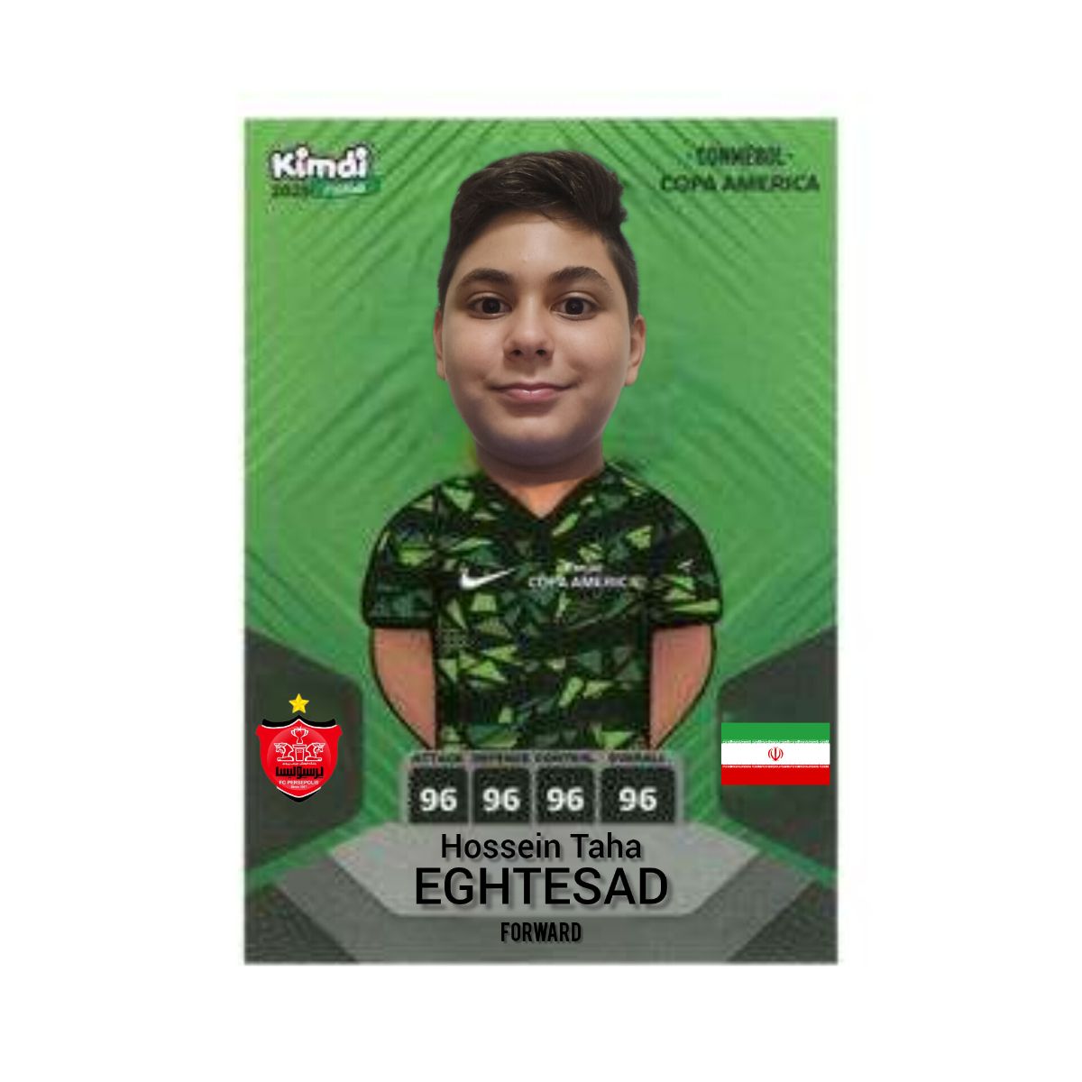 اون کیمدی ساخته شده توسط خودم با نرمافزار اینشات است من بر خلاف همیشه که در تیم رئال خود را میگذارم این دفعه ود را در تیم پرسپولیس تهران و ایران گذاشتم اگر میخواهید آموزش ساخت کارت کوپا را ببینید باید صبر کنید یاد بگیرید باید صبر کنید چه آموزشش را در سایت معتبر و ایرانی آپارات بگذارم.