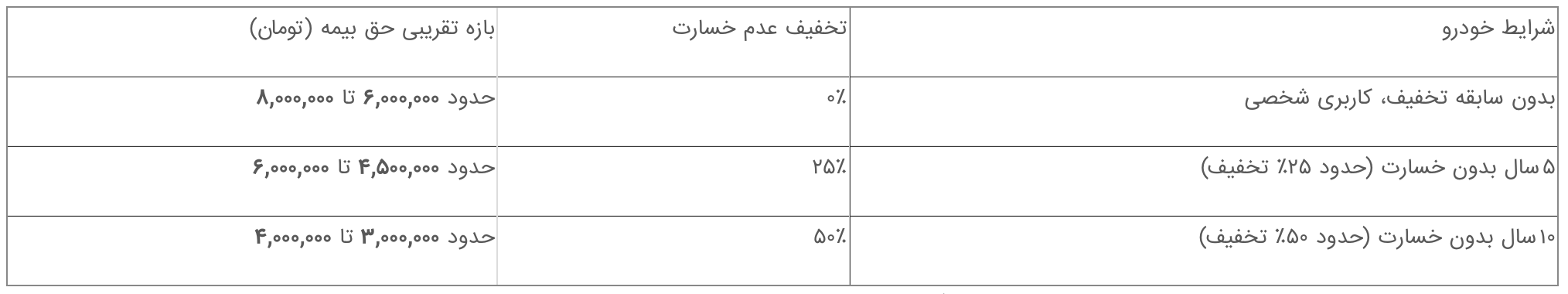 درنظر داشته باشید که این اعداد برآوردی هستند و بسته به شرکت بیمهگر، سال ساخت دقیق خودرو، کاربری و سایر شرایط ممکن است متفاوت باشند.