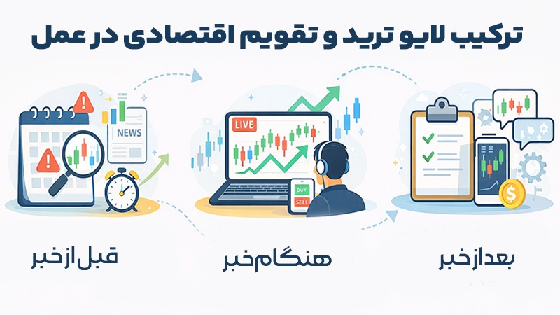 نقطه تغییر واقعی برای من، زمانی اتفاق افتاد که فهمیدم لایو ترید و تقویم اقتصادی قرار نیست جدا از هم استفاده شوند. تا قبل از آن، هرکدام را بهصورت مستقل تجربه کرده بودم؛ تقویم برای دانستن زمان خبر و لایو ترید برای دیدن رفتار بازار؛ اما لحظهای که این دو را همزمان کنار هم گذاشتم، تصویر بازار برایم شفافتر از همیشه شد.