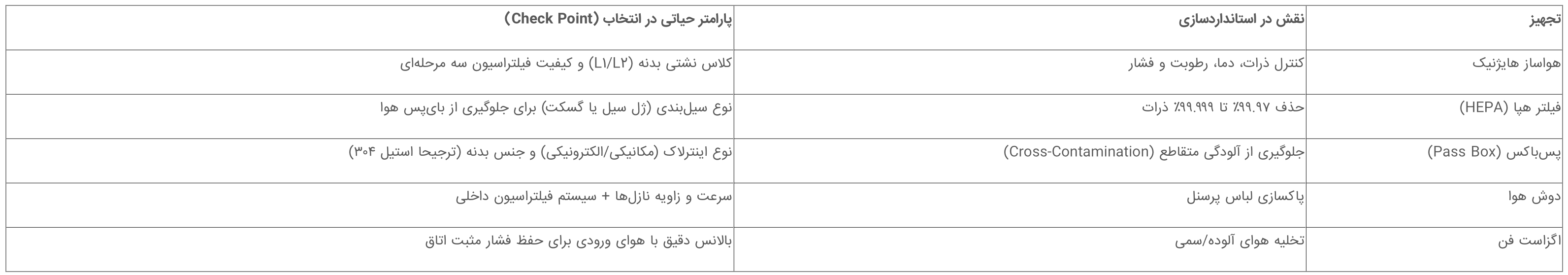 انتخاب صحیح تجهیزات، تضمینکننده پاس شدن تستهای معتبرسازی است. جدول زیر پارامترهای حیاتی انتخاب را نشان میدهد: