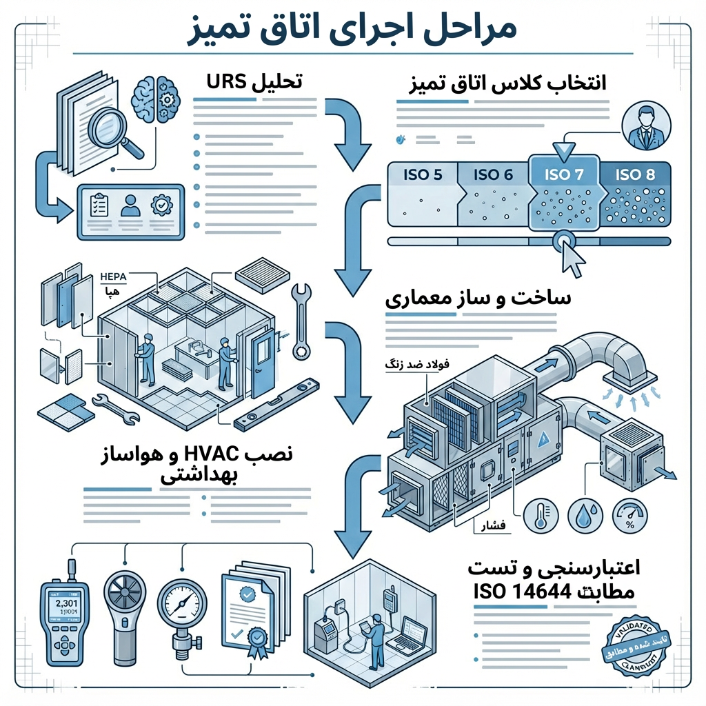 یک شرکت اجرایی معتبر، کار خود را با نیازسنجی کاربر (URS) شروع میکند. این سند مشخص میکند که شما دقیقا چه محصولی تولید میکنید، حساسیت آن چیست و چه حجمی از تولید مدنظر است. بر اساس این سند، کلاس تمیزی (مثلا ISO 7 یا ISO 8) تعیین میشود. اشتباه رایج در این مرحله، انتخاب کلاسهای تمیزی بالاتر از نیاز واقعی است. این کار شاید کیفیت را بالا ببرد، اما هزینههای ساخت و انرژی را به شکل تصاعدی افزایش میدهد. هنر یک شرکت مهندسی، طراحی بهینه است؛ یعنی رسیدن به استاندارد مطلوب با کمترین هزینه ممکن.