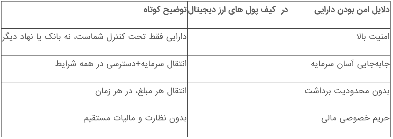 همانطور که با بررسی این ۴ روش متوجه شدید دارایی ها در شرایط کنونی باید در جایی نگهداری شود که هم امنیت بالایی داشته باشد و هم در هر زمان و موقعیتی بتوانید به آن دسترسی پیدا کنید؛ بهترین گزینه کیف پول ارز دیجیتال است. تصور کنید دارایی شما دیگر به ساعت کاری فلان کارمند بانک یا پایداری سیستمهای دولتی گره نخورده است. از طرفی، کابوس سرقت طلا و دلار از منزل را هم دیگر ندارید؛ چون دسترسی ان تماما دست خودتان است. جالب نیست؟ شما میتوانید تمام سرمایهتان را در یک حافظه کوچک، در جیب لباس یا حتی با به خاطر سپردن چند کلمه در ذهن خود، از این کشور به آن کشور ببرید، بدون اینکه نگران مالیاتهای عجیب یا محدودیتهای جابهجایی باشید.