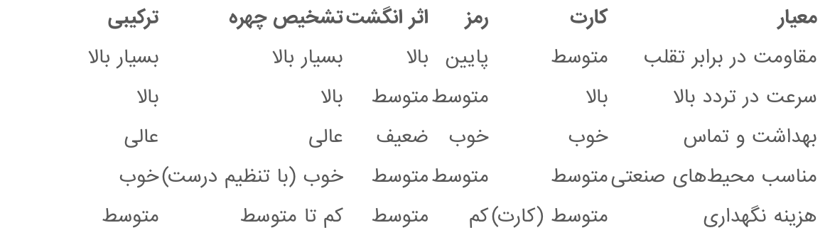 مزایا: غیرتماسی، سرعت بالا، مناسب برای محیطهای پرتردد، کاهش چشمگیر تقلب