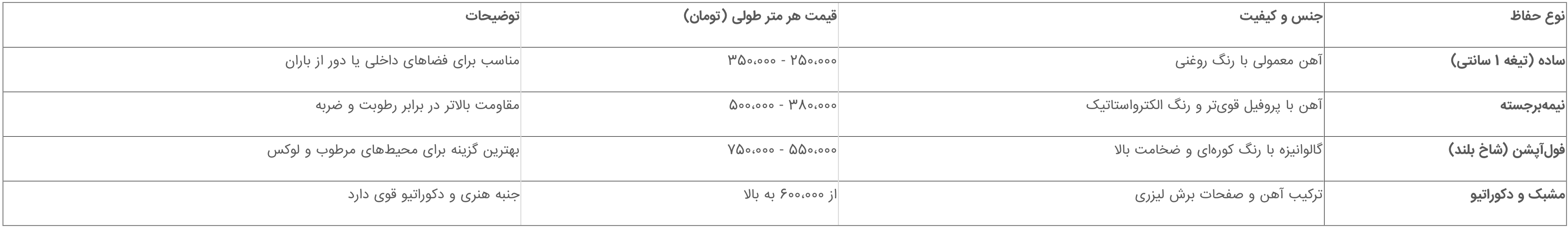 وقتی صحبت از خرید به میان میآید، وحدت اندازهگیری در بازار حفاظ شاخ گوزنی، "متر طولی" یا "متر مربع" است. برای نردههای حیاطی و بلند، اغلب بر اساس متر طولی قیمت داده میشود. برای اینکه دید بهتری نسبت به هزینهها داشته باشید، در جدول زیر محدوده قیمتی انواع رایج این محصول بر اساس متراژ و کیفیت آورده شده است. توجه داشته باشید که این ارقام بر اساس آخرین قیمتهای موجود در بازار و سایتهای فروش جمعآوری شده و تقریبی هستند.