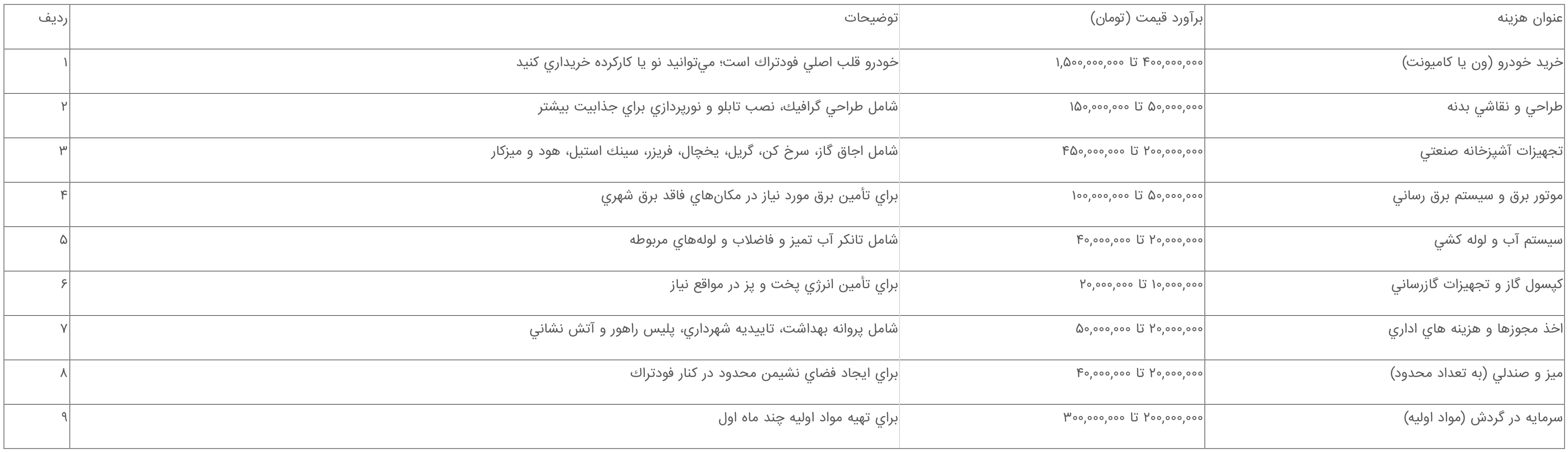 بر اساس بررسي طرحهاي توجيهي معتبر، سرمايه گذاري كل براي راه اندازي يك فست فود سيار در سال 1404 و 1405 حدود ۱.۵ ميليارد تومان برآورد شده است كه البته اين مبلغ با توجه به نوع خودرو، تجهيزات و ميزان سفارشي سازي ميتواند متغير باشد.