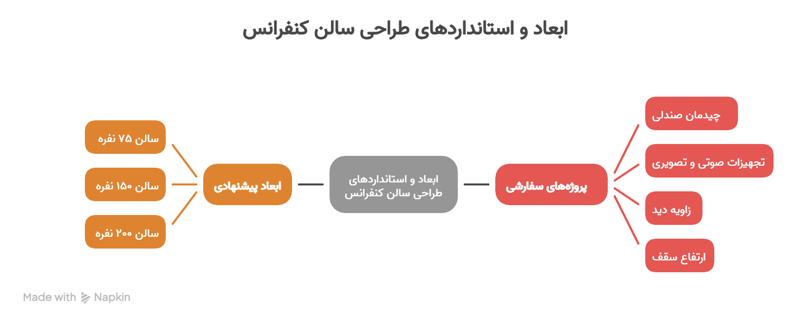 در پروژههای سفارشی، کارشناسان ما ابعاد را بر اساس چیدمان صندلی، نوع تجهیزات صوتی و تصویری، زاویه دید و ارتفاع سقف محاسبه میکنند تا هم از نظر زیباییشناسی و هم عملکردی بهترین نتیجه حاصل شود.