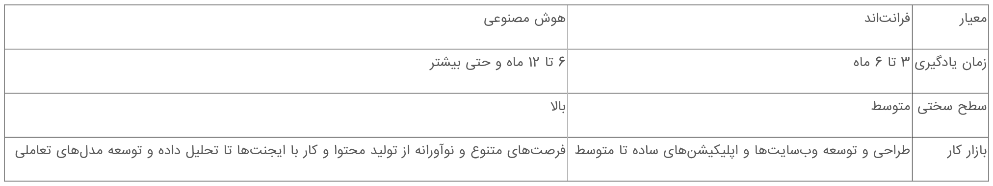 مسیر یادگیری برنامه نویسی فرانتاند کوتاهتر است و بسیاری از مبتدیها میتوانند به راحتی در ظرف ۳ تا ۶ ماه پروژه بگیرند و قرارداد ببندند، در حالی که مسیر یادگیری برنامه نویسی هوش مصنوعی به دلیل پیشنیازهای ریاضی و برنامهنویسی طولانیتر است و یادگیری کامل آن معمولا بین 6 تا ۱۲ ماه و حتی بیشتر طول میکشد. این تفاوت زمان یادگیری باعث میشود فرانتاند برای ورود سریعتر به بازار کار مناسبتر باشد؛ اما مسیر AI برای شما فرصت یادگیری عمیقتر و همکاری در پروژههای نوآورانهتری را فراهم میکند.