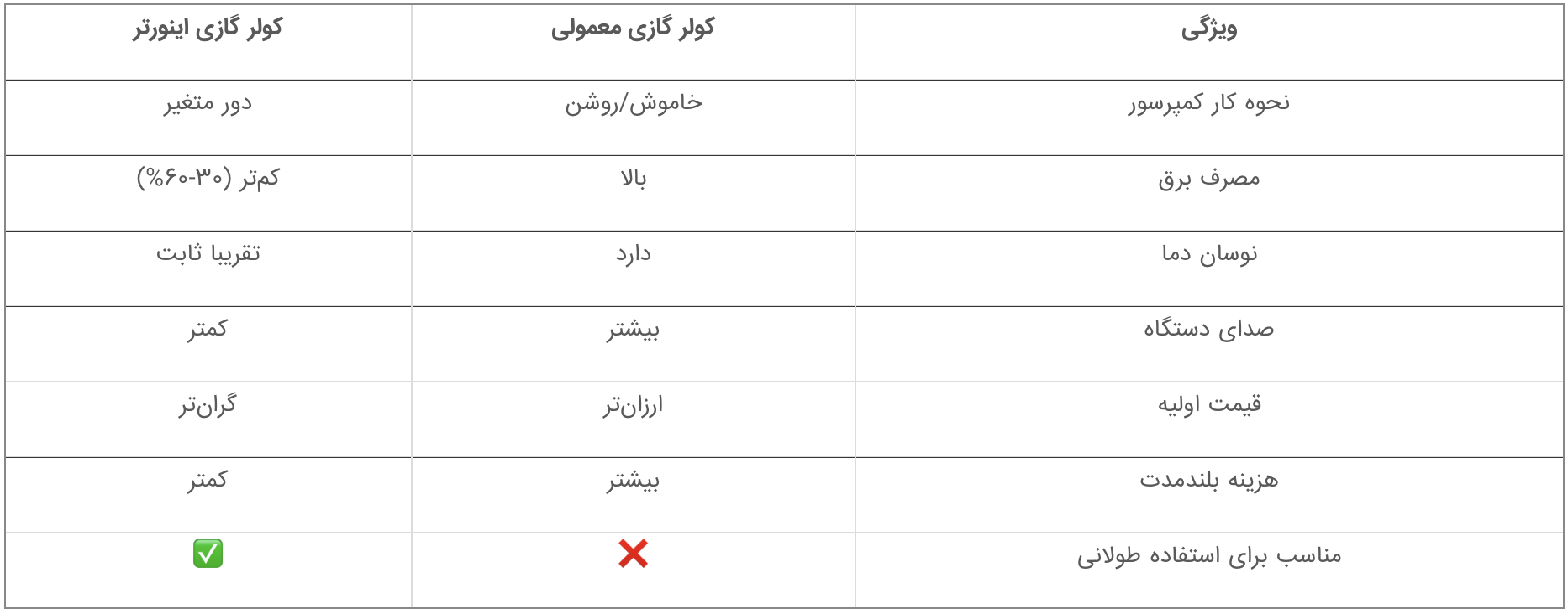 کولر گازی اینورتر از تکنولوژی پیشرفتهتری استفاده میکند. در این سیستم، کمپرسور بهصورت هوشمند و با دور متغیر کار میکند، نه خاموش و روشن شدنهای پیدرپی.