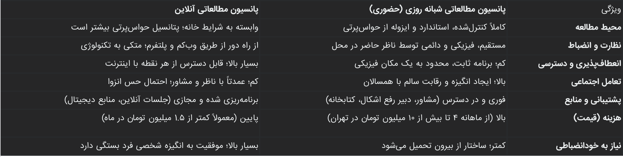 این یافتههای علمی که توسط منابع معتبری چون «مرکز اطلاعات علمی جهاد دانشگاهی (SID)» و مقالات منتشر شده در «کنفرانسهای بینالمللی علوم تربیتی» نیز تایید شدهاند، نشان میدهد که پانسیونهای حضوری با سرمایهگذاری روی یک محیط استاندارد، یک مزیت علمی اثباتشده دارند. در پانسیون آنلاین، این مسئولیت بزرگ بر عهده خود شماست.