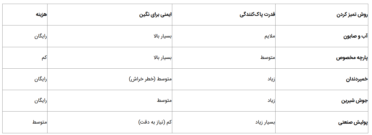 جدول مقایسه روشهای تمیز کردن انگشتر:
