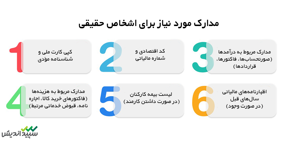 اشخاص حقیقی باید مدارکی مثل کارت ملی، کد اقتصادی، مدارک درآمد و هزینهها را آماده کنند.