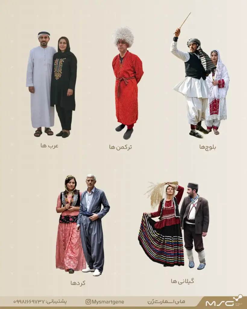 در جستجوی عبارت «تصویر اقوام ایرانی» در فضای اینترنت، معمولاً مجموعهای از پوششهای سنتی با عنوانهایی مانند عرب، ترکمن، بلوچ، گیلک و کرد مشاهده میشود. این تصاویر بهصورت دستهجمعی طراحی شدهاند و هدف آنها نمایش تنوع قومی ایران است.