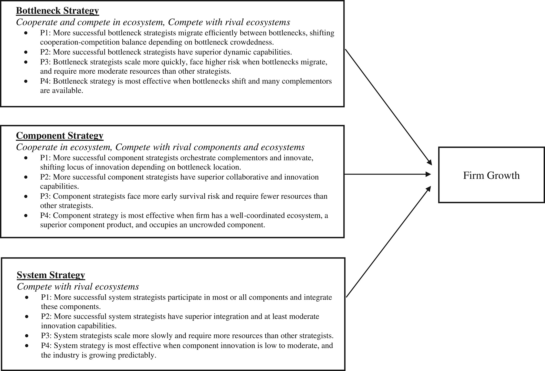 در این مقاله، سه استراتژی متمایز برای فعالیت در اکوسیستمها شناسایی شده است: استراتژی سیستم، استراتژی مؤلفه، و استراتژی گلوگاه. استراتژی سیستم بر ورود همزمان به چند مؤلفه اکوسیستم و کنترل کامل زنجیره ارزش تأکید دارد. شرکتهایی که این مسیر را انتخاب میکنند، معمولاً به دنبال کاهش وابستگی به شرکای بیرونی و ایجاد تجربهای یکپارچه برای مشتریان هستند. در مقابل، استراتژی مؤلفه بر تخصصگرایی در یک بخش خاص از اکوسیستم و همکاری با سایر بازیگران برای تکمیل زنجیره ارزش تمرکز دارد. این رویکرد به شرکتها اجازه میدهد با منابع محدود، وارد اکوسیستم شوند و از طریق نوآوری در مؤلفه خود، مزیت رقابتی کسب کنند.