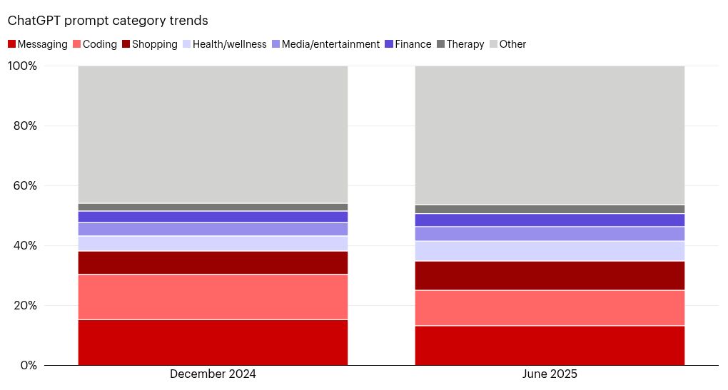 در همین بازه، نرخ کلیک روی لینکهای ارائهشده توسط ChatGPT از ۲.۲٪ به ۵.۷٪ رسیده که نشاندهندهی اعتماد بیشتر کاربران به توصیههای این ابزارها و نقش پررنگتر آنها در هدایت رفتار خرید است. در مقابل، جستوجوهای مربوط به کدنویسی کاهش یافتهاند؛ از ۱۵.۱٪ به ۱۱.۹٪. این افت ممکن است به دلیل بلوغ زودهنگام این حوزه باشد یا مهاجرت برنامهنویسان به ابزارهای تخصصیتر مانند Cursor یا Replit. حوزه سلامت اما رشد قابل توجهی داشته، چرا که کاربران از ChatGPT برای تفسیر نتایج آزمایشها و درک بهتر تشخیصهای پزشکی استفاده میکنند، روندی که با بهینهسازی GPT-5 برای کاربردهای پزشکی، شتاب بیشتری گرفته است.