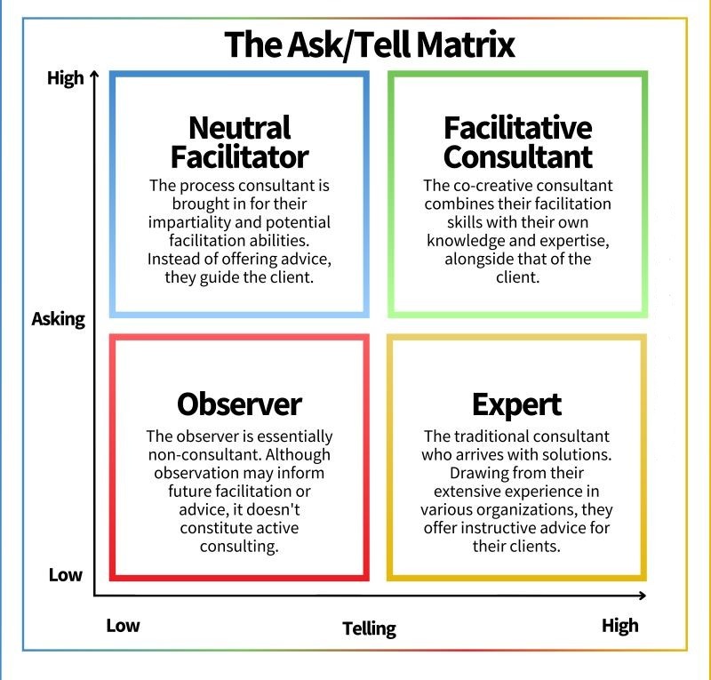 ماتریس Ask/Tell یکی از ابزارهای کلاسیک شرکت مشاوره مکنزی (McKinsey & Company) است که برای ارزیابی و انتخاب سبک ارتباطی یا مشاورهایِ مناسب در موقعیتهای مختلف، طراحی شده است. این ماتریس بر پایه دو بعد کلیدی بنا شده است:
