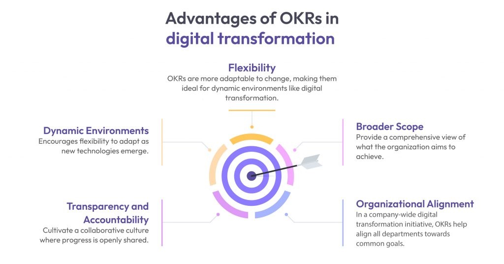 تحول دیجیتال اغلب با چالشهایی مانند مقاومت کارکنان، عدم همراستایی تیمها و اولویتبندی نادرست همراه است. برای مثال، مدیران فناوری اطلاعات ممکن است با سیل دادههای پراکنده، سیستمهای ناسازگار و نیاز به چابکی روبرو شوند. در این روایت، OKRها مانند یک قطبنما عمل میکنند: آنها تمرکز را حفظ میکنند، اولویتها را همراستا میسازند و شفافیت ایجاد میکنند. بر اساس تجربیات شرکتهایی مانند Deutsche Telekom، آنها کمک میکنند تا اهداف سازمانی با ابتکارات دیجیتال همراستا شوند، مثلاً با کاهش هزینههای زیرساخت IT از طریق مهاجرت به فضای ابری. تحلیلی عمیقتر نشان میدهد که OKRها با ادغام در مدلهای عملیاتی مدرن، چالشهای دیجیتال را به فرصت تبدیل میکنند؛ آنها نه تنها پیشرفت را اندازهگیری میکنند، بلکه فرهنگ یادگیری مداوم و سازگاری را پرورش میدهند، و سازمان را از حالت ایستا به پویا میبرند.