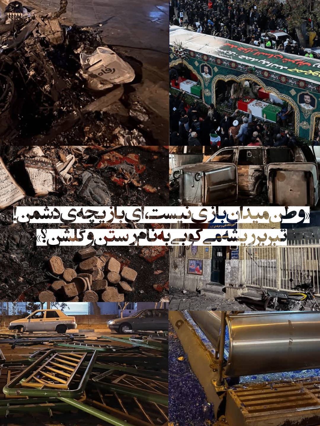 تخریب و نابود کردن اموال عمومی و زیرساختهای رفاهی، کشتار وحشیانه و داعش گونه مردم بیدفاع و نیروهای حافظ امنیت و سوزاندن مکانهای مقدس مردم، گواهی روشنی بر حضور مزدوران بیگانه در خیابانهای کشورمان بود. مردم ایران، هموطنان خود را وحشیانه به قتل نمیرسانند، پرستار بیگناه را در درمانگاه نمیسوزانند، به ملینا، دختربچهی بیخبر از همه جا، شلیک نمیکنند... "آن مزدوران قاتل، مردم ایران نبودند..."