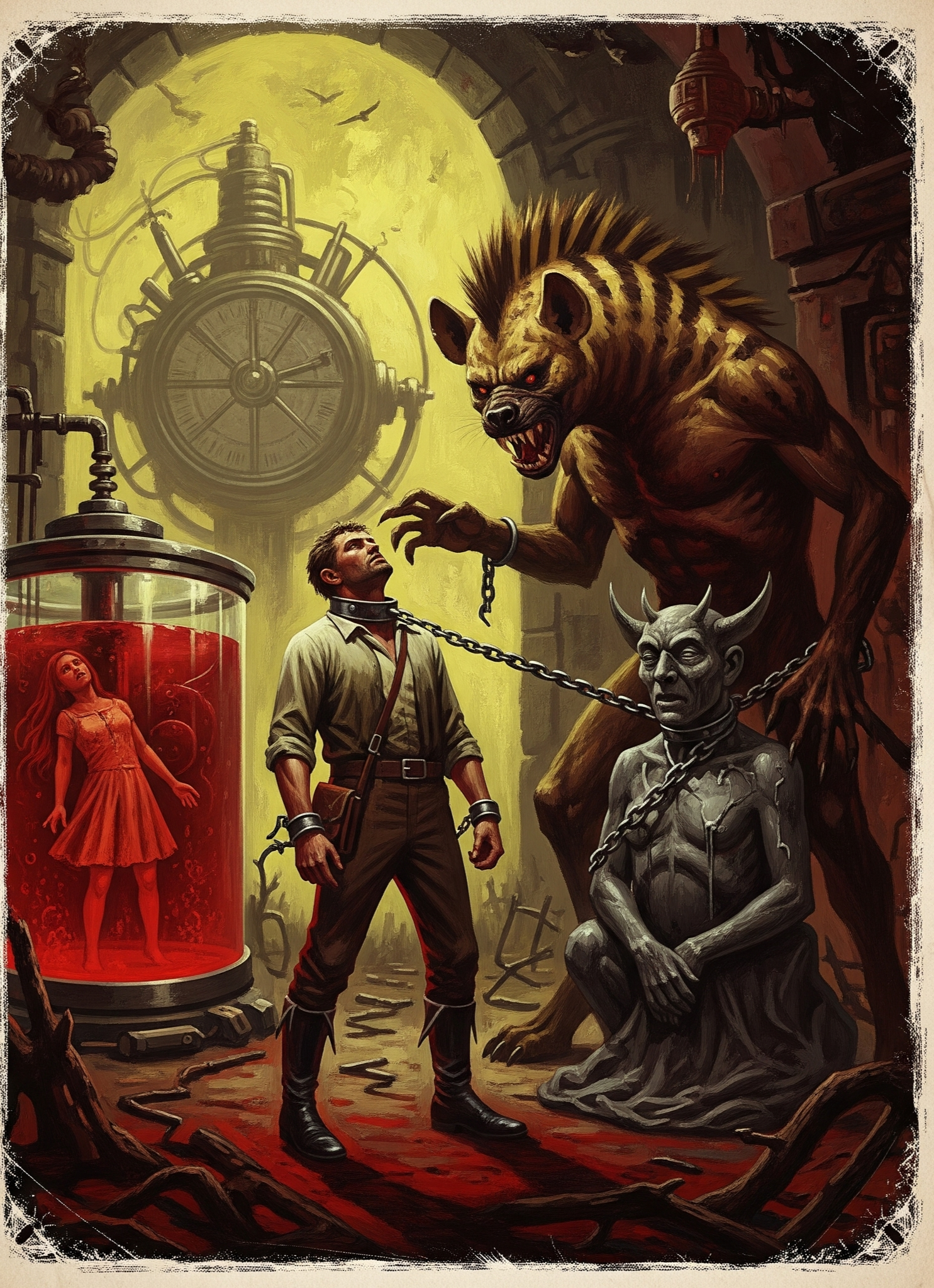 شکارچی به آن سو رفت و از پایین تا بالای یکی از مخزن هارا مشاهده کرد ، از سم های غول پیکر و پا های فلس مانند تا شکم و سینه ای به شکل دیو و چهره هایی به اشکال درنده خویان را مشاهده کرد ،شکارچی پس از نظاره گفت : اینجا یک آزمایشگاه نظامی بنظر میرسد، مشخص نیست آنان دقیقا در اینجا چه میکردند ؟! دختر پاسخ داد : باید ازین جا خارج شویم.